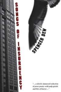 Spencer Dew’s Songs of Insurgency tempts, at the onset, a reader to regard it as pulp fiction, with all the trash, horror, urban decay and inanity of modern life ladled in a roux prose of fragmented thoughts basting among loosely simmered run-ons. He starts with phone sex in the story “Blow,” imagines a camp for teaching the finer points of suicide in “The Exit Colony,” and flows through other snapshots of noir, sadism and numbness until reaching his peroration in the longish tale “At the Darfur Bake Sale.” Songs of Insurgency tempts the reader, but does not wholly convince the reader to accept it as pulp because underpinning it, throughout, in varying levels of sublimity, the work circles but never quite states that it isn’t actually about 9/11, or about Darfur, or about phone sex. It’s about cliché. And saturation. And how our perceptions as Western readers and intellectuals cannot easily be divorced from the media in which we live.